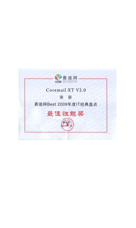 中國數(shù)字與軟件服務業(yè)“創(chuàng)新競爭力產品獎”-廣東盈世計算機科技有限公司-論客Coremail XT安全增強電子郵件系統(tǒng)V6.0