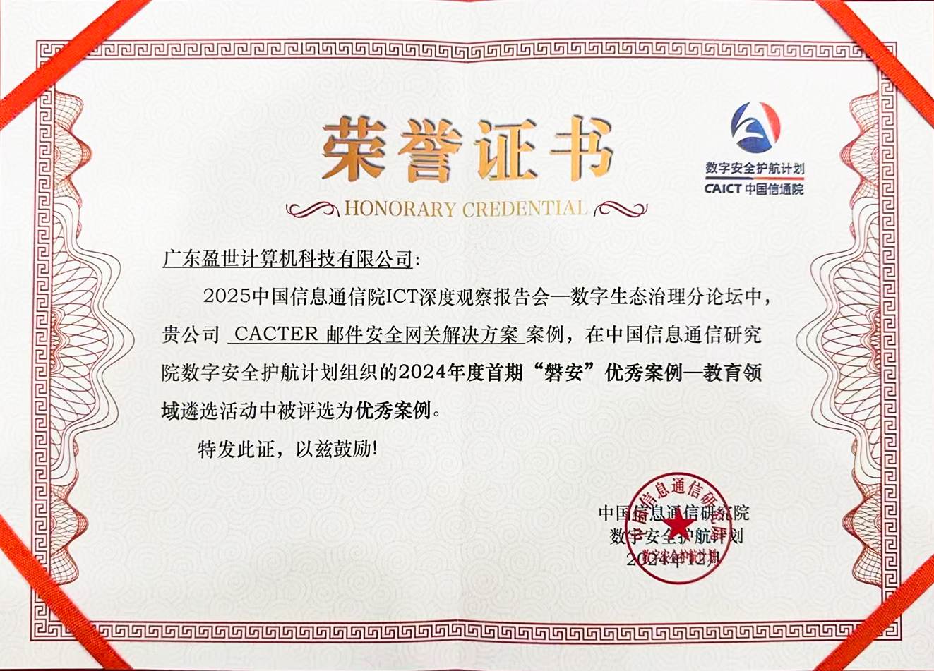 CACTER郵件數(shù)據(jù)防泄漏解決方案入選中國信通院《技術開發(fā)解決方案集(2024)》-廣東盈世
